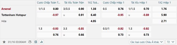 Tip kèo Châu Á hiệp 1 Arsenal vs Tottenham