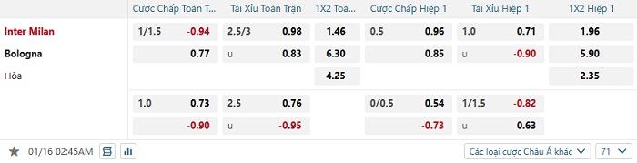 Tip kèo Châu Á hiệp 1 Inter vs Bologna