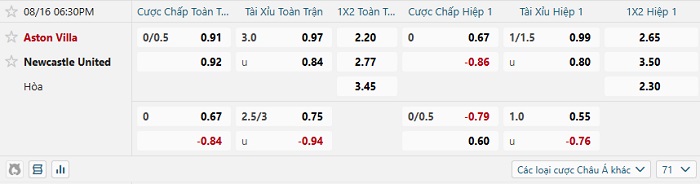 Tip kèo Châu Á full trận Aston Villa vs Newcastle