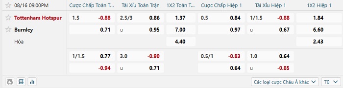 Tip kèo Châu Á full trận Tottenham vs Burnley