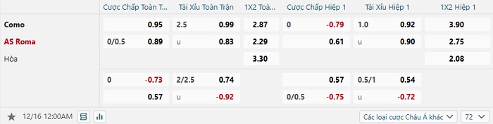 Tip kèo Châu Á hiệp 1 Como vs Roma