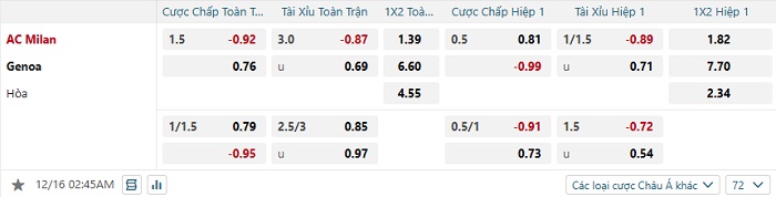 Tip kèo Châu Á hiệp 1 Milan vs Genoa