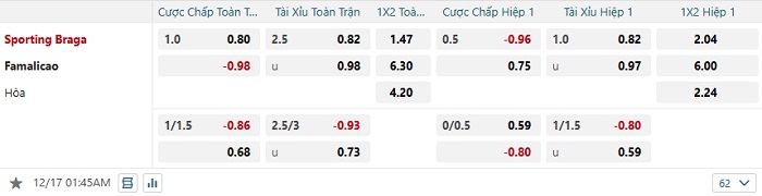 Tip kèo Châu Á hiệp 1 Sporting Braga vs Famalicao