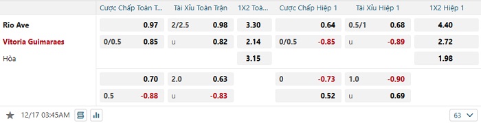 Tip kèo Châu Á hiệp 1 Rio Ave vs Vitoria Guimaraes