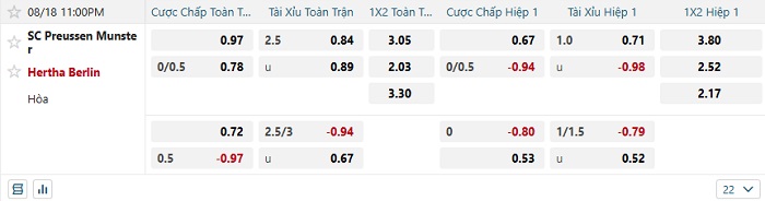 Tip kèo Châu Á hiệp 1 Preussen Munster vs Hertha Berlin