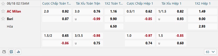 Tip kèo Châu Á hiệp 1 Milan vs Bari