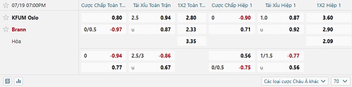 Tip kèo Châu Á hiệp 1 KFUM Oslo vs Brann