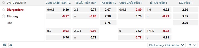 Tip kèo Châu Á hiệp 1 Djurgardens vs Elfsborg