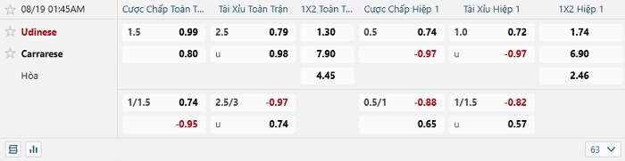Tip kèo Châu Á full trận Udinese vs Carrarese