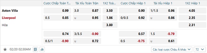 Tip kèo Châu Á full trận Aston Villa vs Liverpool