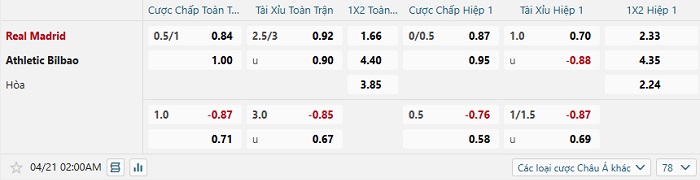 Tip kèo Châu Á hiệp 1 Real Madrid vs Bilbao