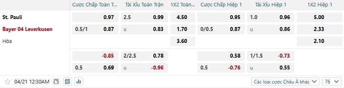 Tip kèo Châu Á hiệp 1 St. Pauli vs Bayer Leverkusen