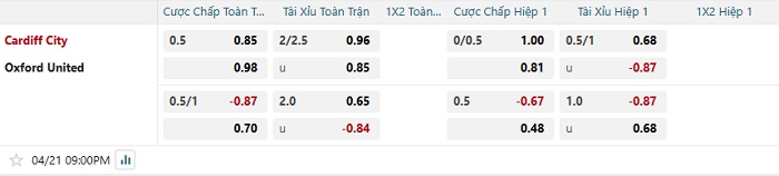 Tip kèo Châu Á hiệp 1 Cardiff vs Oxford
