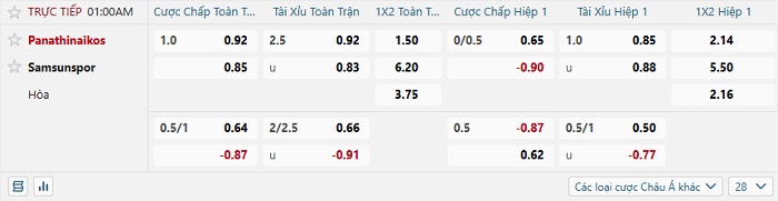 Tip kèo Châu Á hiệp 1 Panathinaikos vs Samsunspor
