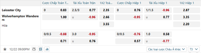 Tip kèo Châu Á full trận Leicester vs Wolves