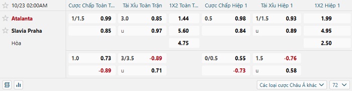 Tip kèo Châu Á full trận Atalanta vs Slavia Praha