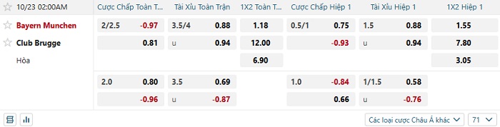 Tip kèo Châu Á hiệp 1 Bayern Munich vs Club Brugge