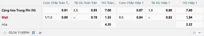 Tip kèo Châu Á hiệp 1 CH Trung Phi vs Mali