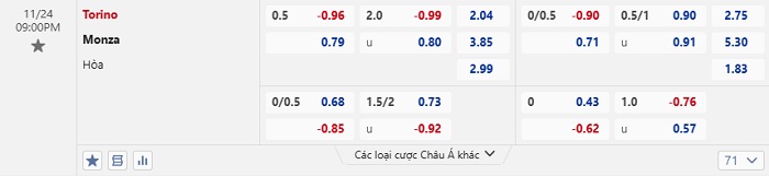 Tip kèo Châu Á hiệp 1 Torino vs Monza
