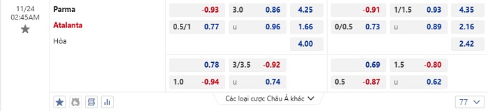 Tip kèo Châu Á hiệp 1 Parma vs Atalanta