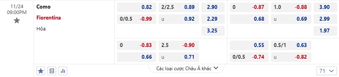Tip kèo Châu Á full trận Como vs Fiorentina