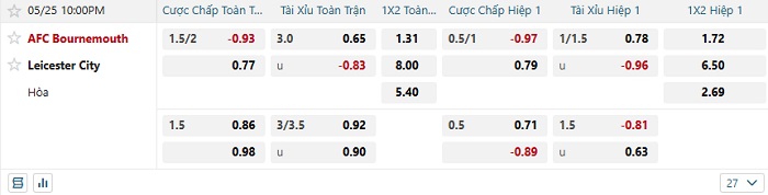Tip kèo Châu Á full trận Bournemouth vs Leicester