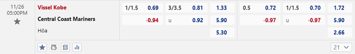 Tip kèo Châu Á full trận Vissel Kobe vs Central Coast