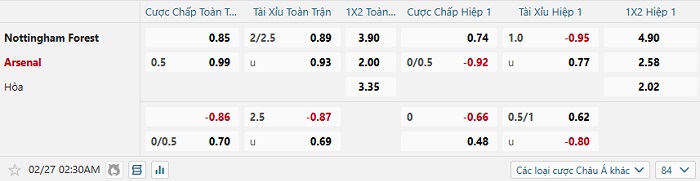 Tip kèo Châu Á hiệp 1 Nottingham vs Arsenal