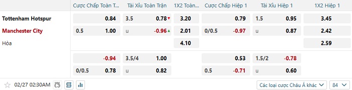 Tip kèo Châu Á hiệp 1 Tottenham vs Man City