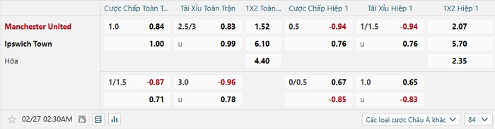Tip kèo Châu Á full trận Man United vs Ipswich