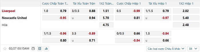 Tip kèo Châu Á full trận Liverpool vs Newcastle