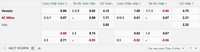 Tip kèo Châu Á hiệp 1 Venezia vs Milan
