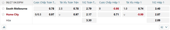 • Dự đoán tỷ số hiệp 1: South Melbourne 0 – 0 Hume City