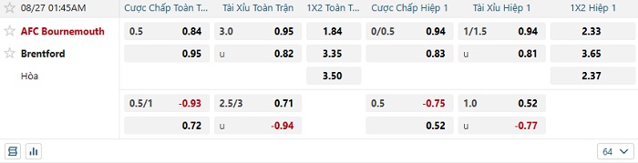 Tip kèo Châu Á hiệp 1 Bournemouth vs Brentford