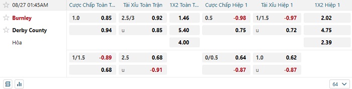 Tip kèo Châu Á hiệp 1 Burnley vs Derby County