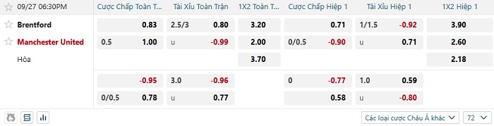 Tip kèo Châu Á hiệp 1 Brentford vs Man United