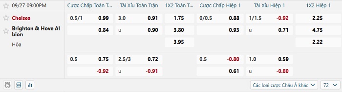 Tip kèo Châu Á full trận Chelsea vs Brighton
