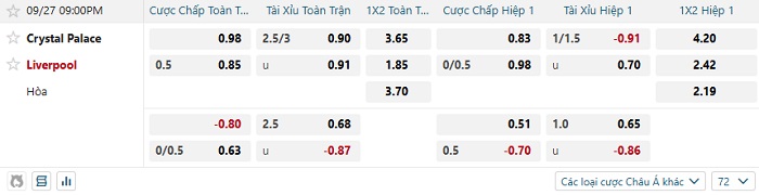 Tip kèo Châu Á full trận Crystal Palace vs Liverpool