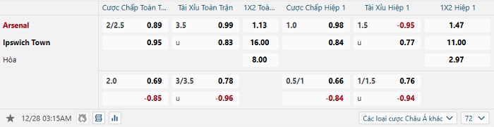 Tip kèo Châu Á hiệp 1 Arsenal vs Ipswich