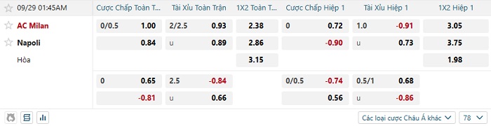 Tip kèo Châu Á hiệp 1 Milan vs Napoli