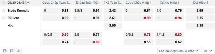 Tip kèo Châu Á hiệp 1 Rennes vs Lens