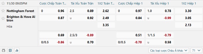 Tip kèo Châu Á hiệp 1 Nottingham vs Brighton