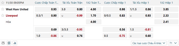 Tip kèo Châu Á hiệp 1 West Ham vs Liverpool
