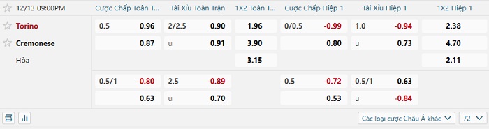 Soi kèo châu Á, kèo Torino vs Cremonese