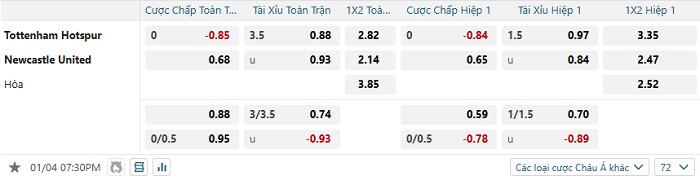 Bảng tỷ lệ kèo bóng đá Tottenham vs Newcastle