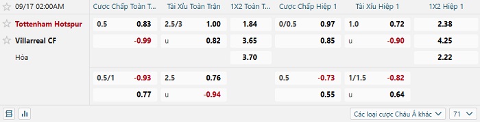 Bảng tỷ lệ kèo bóng đá hôm nay Tottenham vs Villarreal