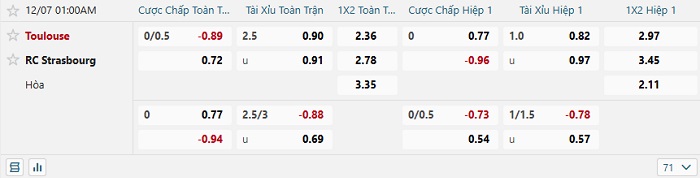 Bảng kèo bóng đá Toulouse vs Strasbourg
