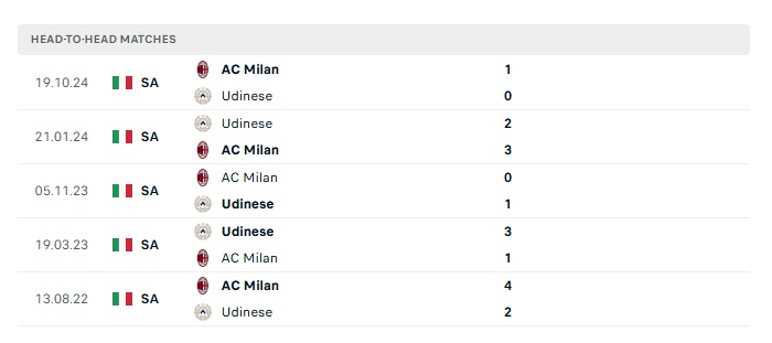 - Kèo tỷ số H2 Udinese vs AC Milan: 0-1