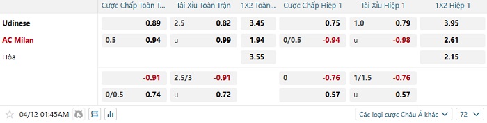 Bảng tỷ lệ kèo bóng đá hôm nay Udinese vs AC Milan