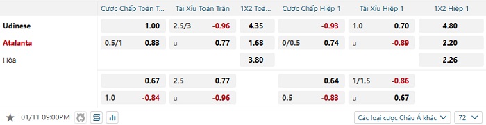 Bảng tỷ lệ kèo bóng đá Udinese vs Atalanta